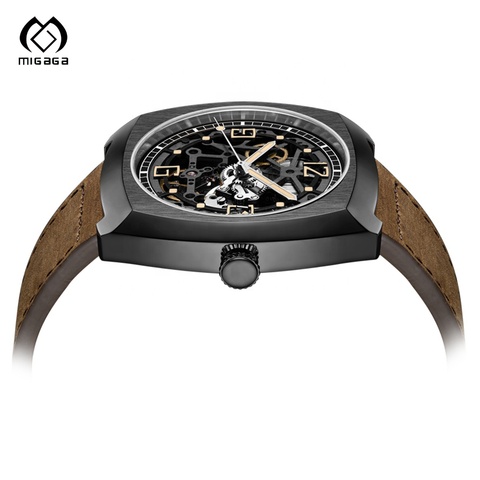 Migaga Custom Logo Genuile Leather 5ATM Luminous Waterproof Mechanical Square Automatic Skeleton Watch for Men