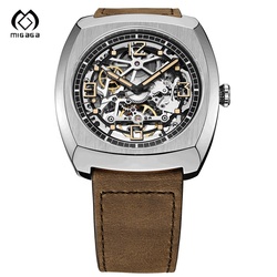 Migaga شعار مخصص جلد guenile 5ATM مضيئة للماء الميكانيكية مربع التلقائي هيكل عظمي ساعة للرجال